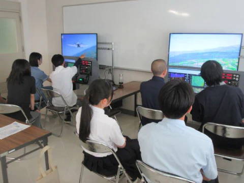 フライトシミュレータの操縦体験の様子(千馬先生)