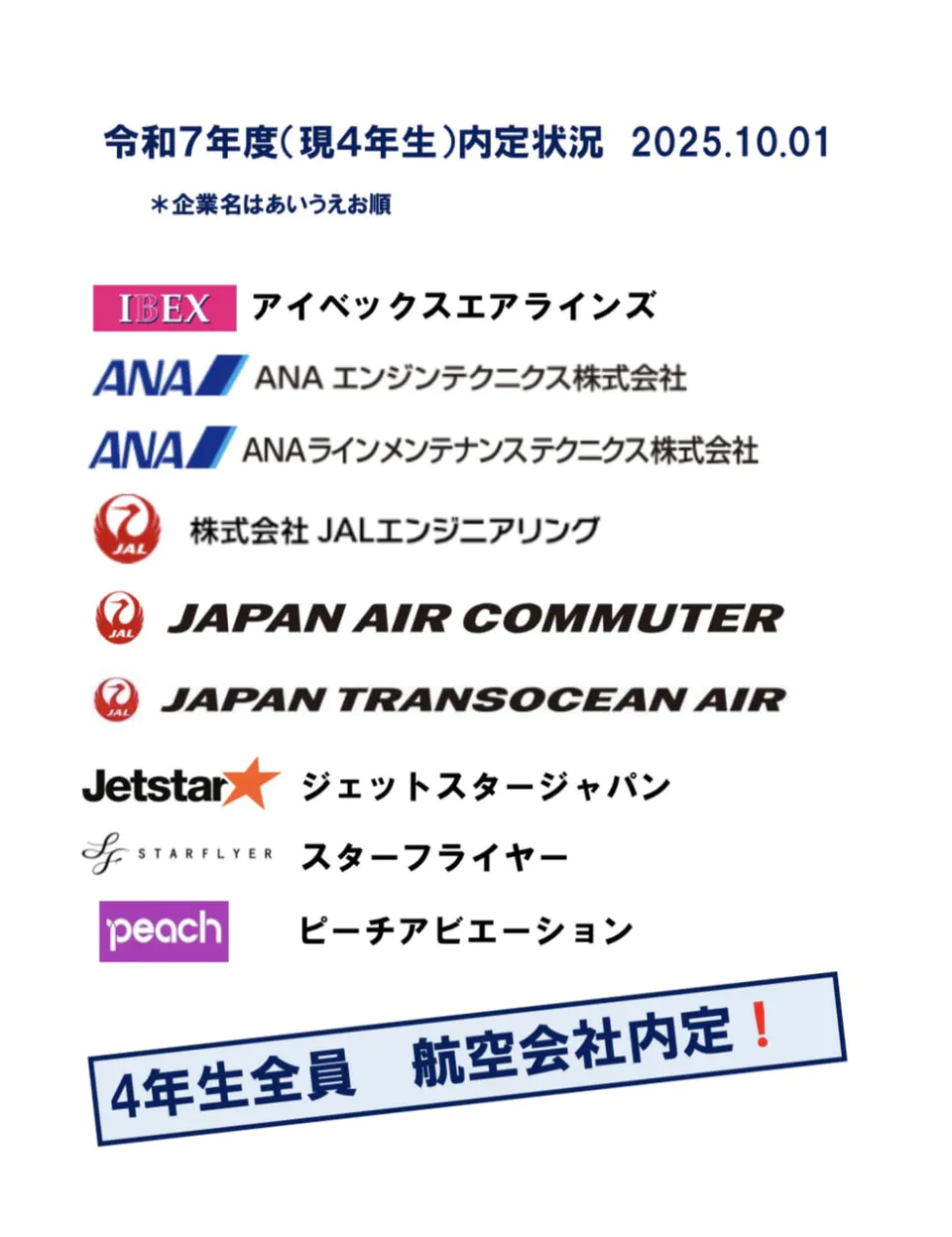 航空整備学専攻4年生は就職活動も終わり、全員が航空会社に内定を頂くことができ、10月1日に各社内定式に参加して参りました。