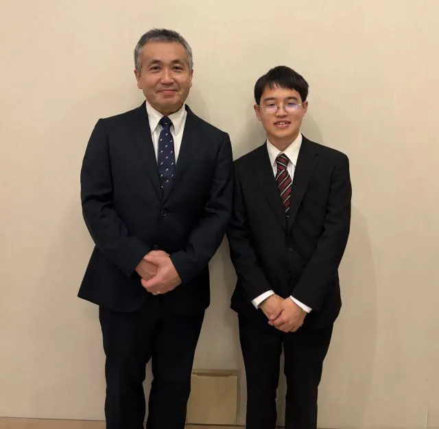懇親会にて若田宇宙飛行士(左)と4年生・山田 健太郎さん(右)