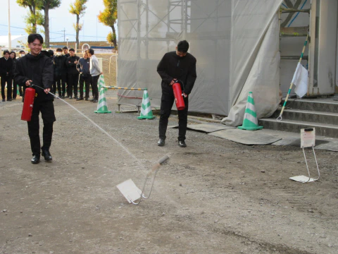 消火器使用体験では、消火器の取扱い方、消火剤を放出する際の距離感等も学びました。