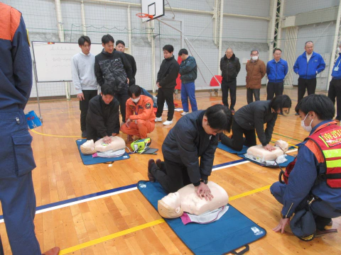 心肺蘇生とAED体験では、胸骨圧迫を行う際にどの程度の力を入れれば良いか、AEDを実施する場合の方法や留意点について学びました。