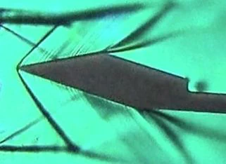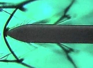 シュリーレン法とは、空気の密度の違いによって光の進み方が変わる性質を利用した計測法で、模型のまわりで衝撃波がどのように発生しているかを映像として記録し、流れを直観的に把握することができます。