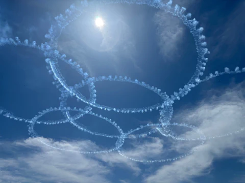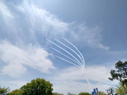 ブルーインパルスの編隊飛行の前に、元ブルーインパルス操縦士の原幸太郎航空操縦学専攻の教官とTKU後藤アナウンサーによるトークショーで雰囲気を盛り上げました。ブルーインパルスの操縦、本日の見どころ、そしてもちろん崇城大学航空操縦学専攻の紹介が行われ、来場者も真剣に耳を傾けていました。![]()